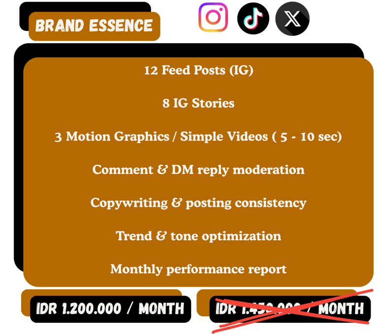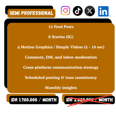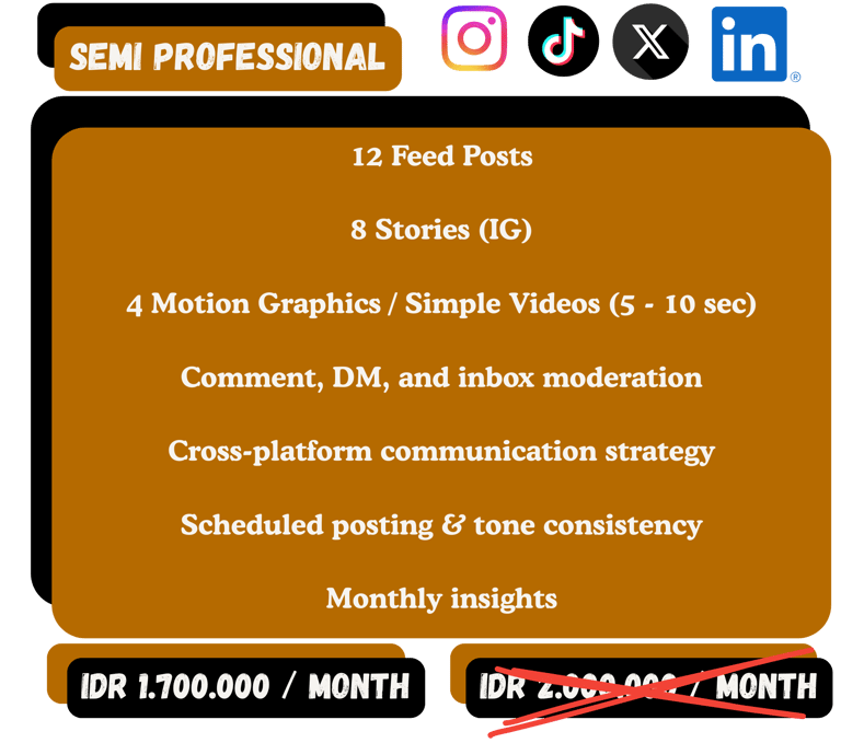 We help business, blog, page, and others to create engaging posts, stories, and even motion graphics. We also help manage upload time, set target audience, copy writing, and even create ads plan. We do this for instagram, tiktok, twitter, linkedin, even youtube.